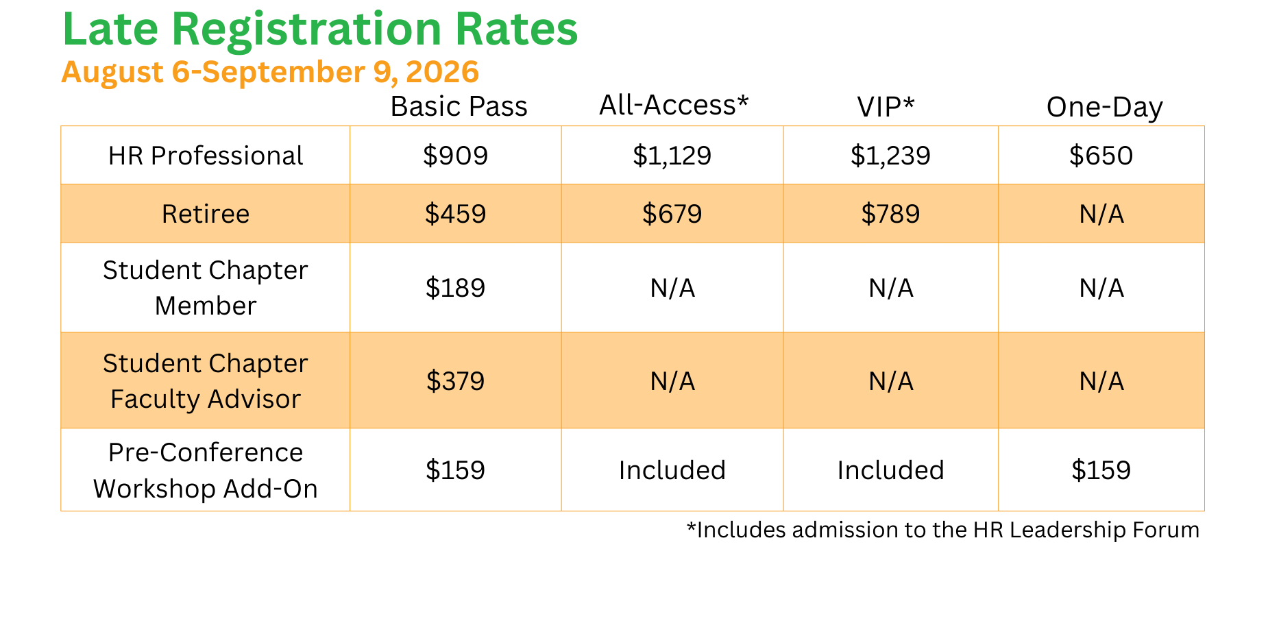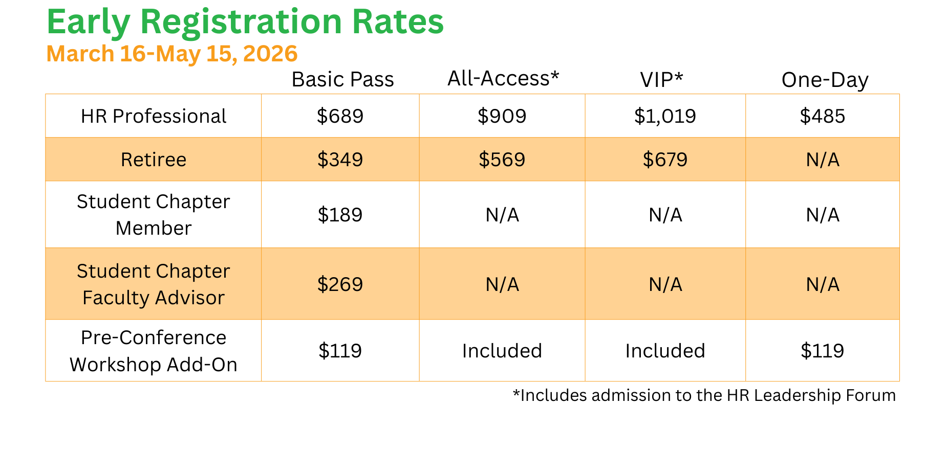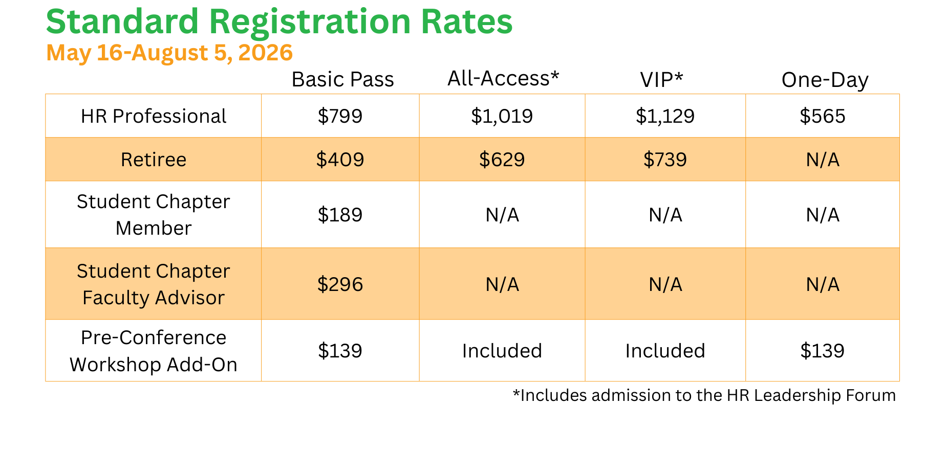 Designed for senior leaders and influencers, the VIP Conference Pass delivers premium access and exclusive perks. VIPs receive full conference and Leadership Forum access, expedited VIP registration check-in, and priority seating at general sessions alongside the NHRMA Board. This elevated experience also includes all hosted meals and events. A donation supporting student travel grants for NHRMA’s HR Leaders of Tomorrow (HRLT) Student Conference is included—making a lasting impact for both the students and the HR Profession.